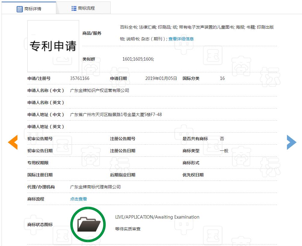 而“专利申请”的商标,也显示的是等待实质审查中!