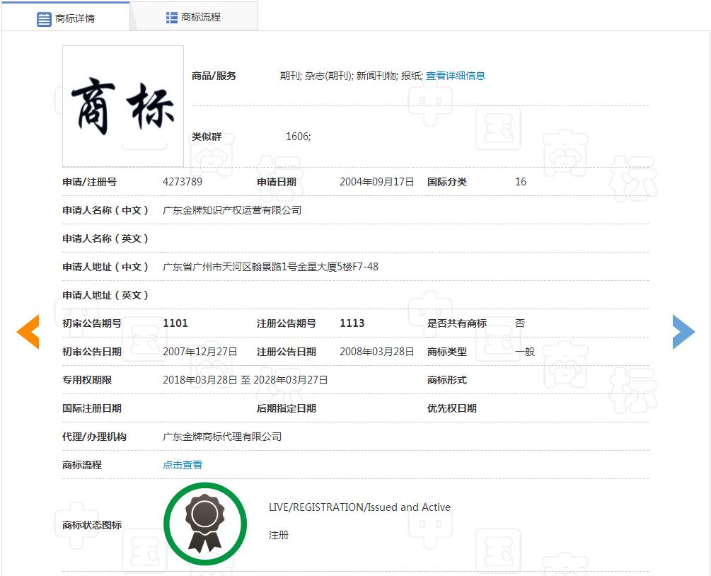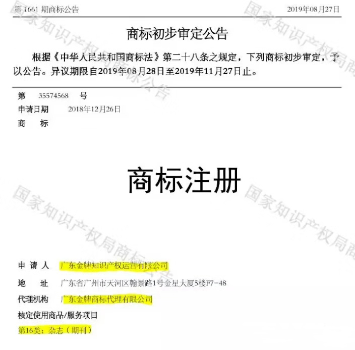 这都已经够震惊的了,更狠的是,申请人这家公司,在前不久还有一件商标同样也下了初审通告,商标名称是“商标注册” 是的,你没有看错,小编我也没有打错字,就是这个名称“商标注册”!