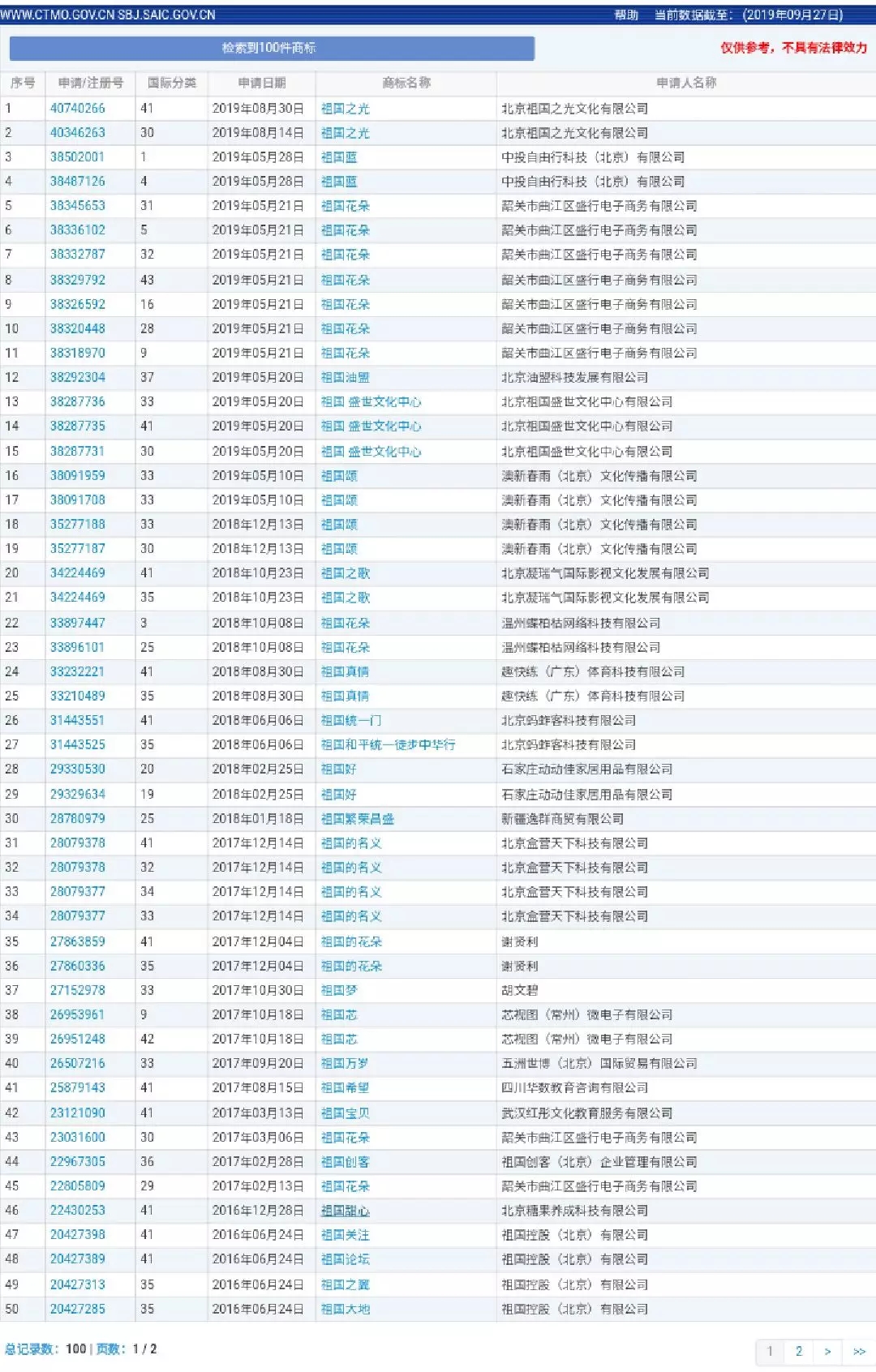据了解,电影《我和我的祖国》的出品公司分别为华夏电影发行有限责任公司;博纳影业集团股份有限公司;阿里巴巴影业集团有限公司,还有联合出品的48家公司,但是所有的相关公司小编都仔仔细细地看来好几遍,就是没有找到“广东佳码影视传媒有限公司”这家公司。而且这部电影的主要出品方,也并没有对该电影做商标申请。如果这部电影在先没有什么知名度的话,也许注不注册商标不会有什么太大的影响,但是从目前的情况来看,如果不提前注册好商标,知识产权的布局没有提前做好,未来电影衍生品的市场可能也会碰到很多问题。根据相关商标注册申请的规定来看,“国”字字样是作为禁止使用的字体,如果不是借“国”字之光去夸大自身,没有给消费者一种混淆视听的不良影响的话,其实是可以尝试申请一下的。至于能不能注册成功,那就要看商标局最终怎么审判了。但是商标网查询中,也还是存在很多商标中含有“祖国”字样的,从查询结果来看,还是有下证的商标的。