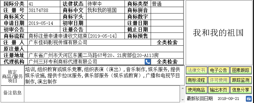 这部电影一共选取了7个历史事件,每一个小故事的导演都不相同,分别是国内7位顶级票房的导演,也集结了娱乐圈几十位有演技的演员们,为我们重现了祖国成立以来的七个成功瞬间,这次的无论是导演还是演员们的阵容可真是中国电影史上最豪华团队,即使是小朋友们的演技也是A到爆炸,看的小编边哭边笑。电影一共是七个片段,分别为《前夜》、《相遇》、《夺冠》、《回归》、《北京你好》、《白昼流星》、《护航》七个事件,都取材于新中国成立70周年以来,具有历史性的瞬间,讲述了7组普通人与大事件息息相关的故事,并以小人物见证大时代。作为知识产权人的我,有一个职业通病,那就是看到什么就会联系到知识产权上面,哈哈哈!但是当我对“我和我的祖国”这个商标查询的时候,发现仅有一个类别商标被申请: