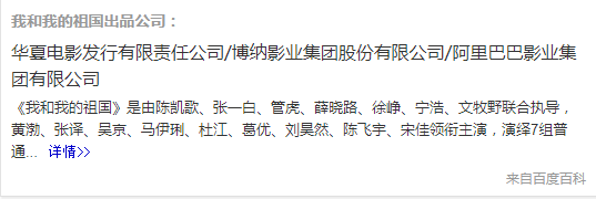从商标信息上来看,只有广东佳码影视传媒有限公司这家在2019年5月14日申请费了41类“我和我的祖国”的商标,其商品服务项目包含了培训;组织教育或娱乐竞赛;组织表演(演出);音乐制作;娱乐服务;提供娱乐设施;提供卡拉OK服务;俱乐部服务(娱乐或教育);广播和电视节目制作;演出制作。而该商标还在等待实质审查。那这个商标的申请人到底是不是“我和我的祖国”该电影的出品方呢?小编在百度百科中“我和我的祖国”查询的结果是: